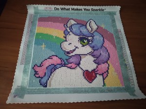 “Unicorn Rainbow” by PixieStyx. Round Drills. 24 colors. 2 ABs. 50.7cm x 32.8 cm (20X213in). This kit came from DAC (Diamond Art Club). Pic above is also from their website, so they own it….