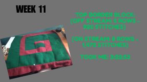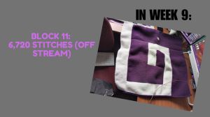 Because I’m me, I created a timelapse of all of this progress, as well as a visual representation of the project breakdown in terms of numbers of stitches. It shows my progress through all of Weeks 9-12, and explains my process in a video form. This video went live on Thursday morning. Hope you enjoy it!!!