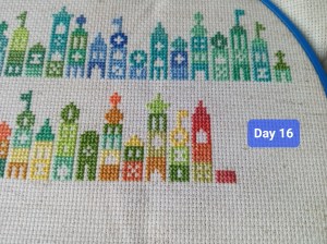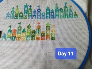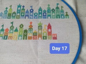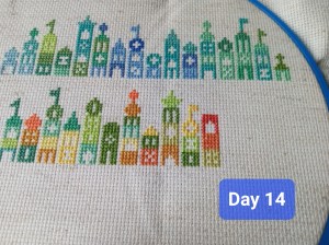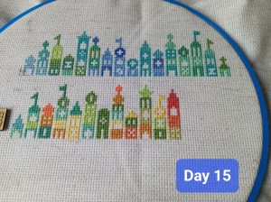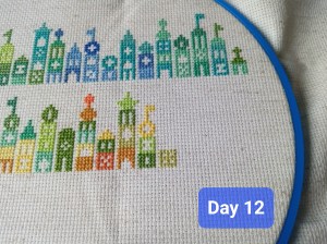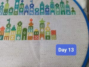 So, this is one of the odd weeks. As I mentioned above, I had issues figuring out how and when I wanted to work on each day of this project. That, and I was a bit trolled by some brain fog, as I tried to figure out how the app works. It’s okay though. We figured it out. It ended up that all three of these days were the same color, so I had some fun stitching them. Here are the pictures I took of each day, so you can see the progression of the days. As you can see, there aren’t many stitches to do each day. It’s what got me thinking that I should give some time between stitching sessions. As I know myself, I thought stitching every Saturday would be the PERFECT way to make sure I keep this project going at a good pace. Usually, I’ll binge projects (and work on them for long amounts of time, risking injuries) until they make me mad, then put them aside for months. I didn’t want to do that to this project, so… This is my solution.